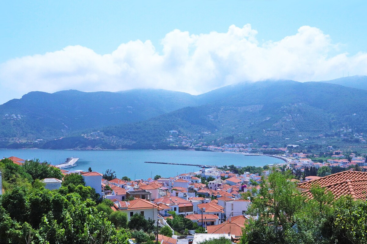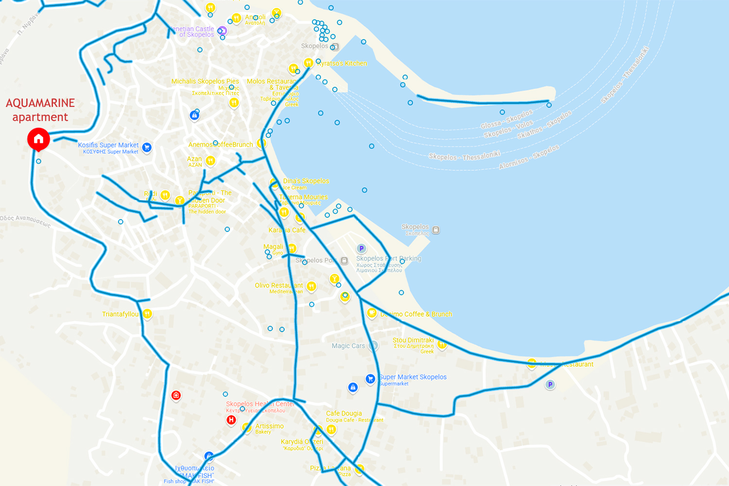 • Facing east, at the top of Skopelos Town, Aquamarine apartment is located on the Ring Road that surrounds the town. An ideal place for those who want the convenience of the town and the amenities nearby, as well as a wonderful unobstructed view of the bay and port of Skopelos.